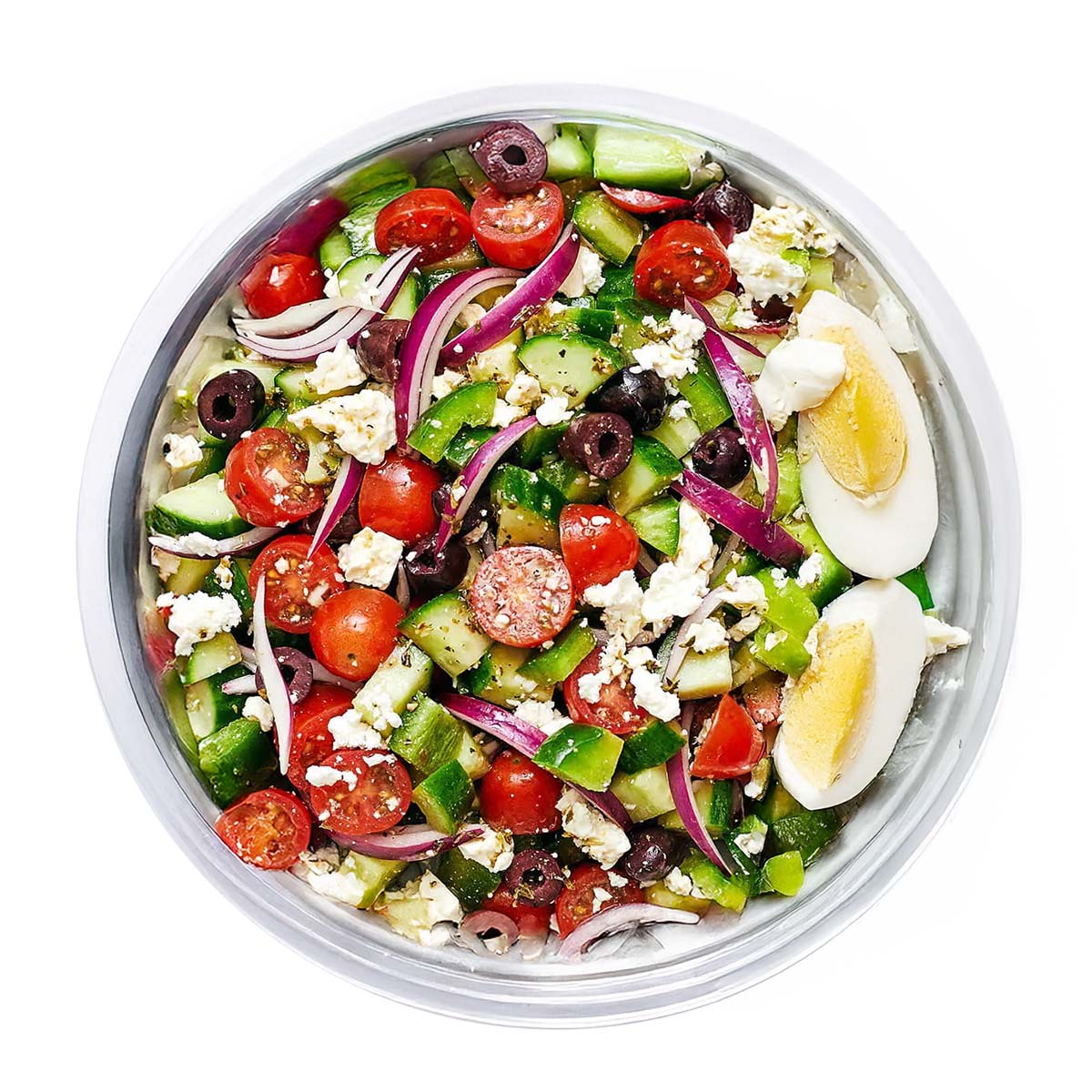 Fresh spinach, chickpeas, egg, tomatoes, olives, cucumber, and Greek dressing — hearty, healthy, and optionally with chicken.