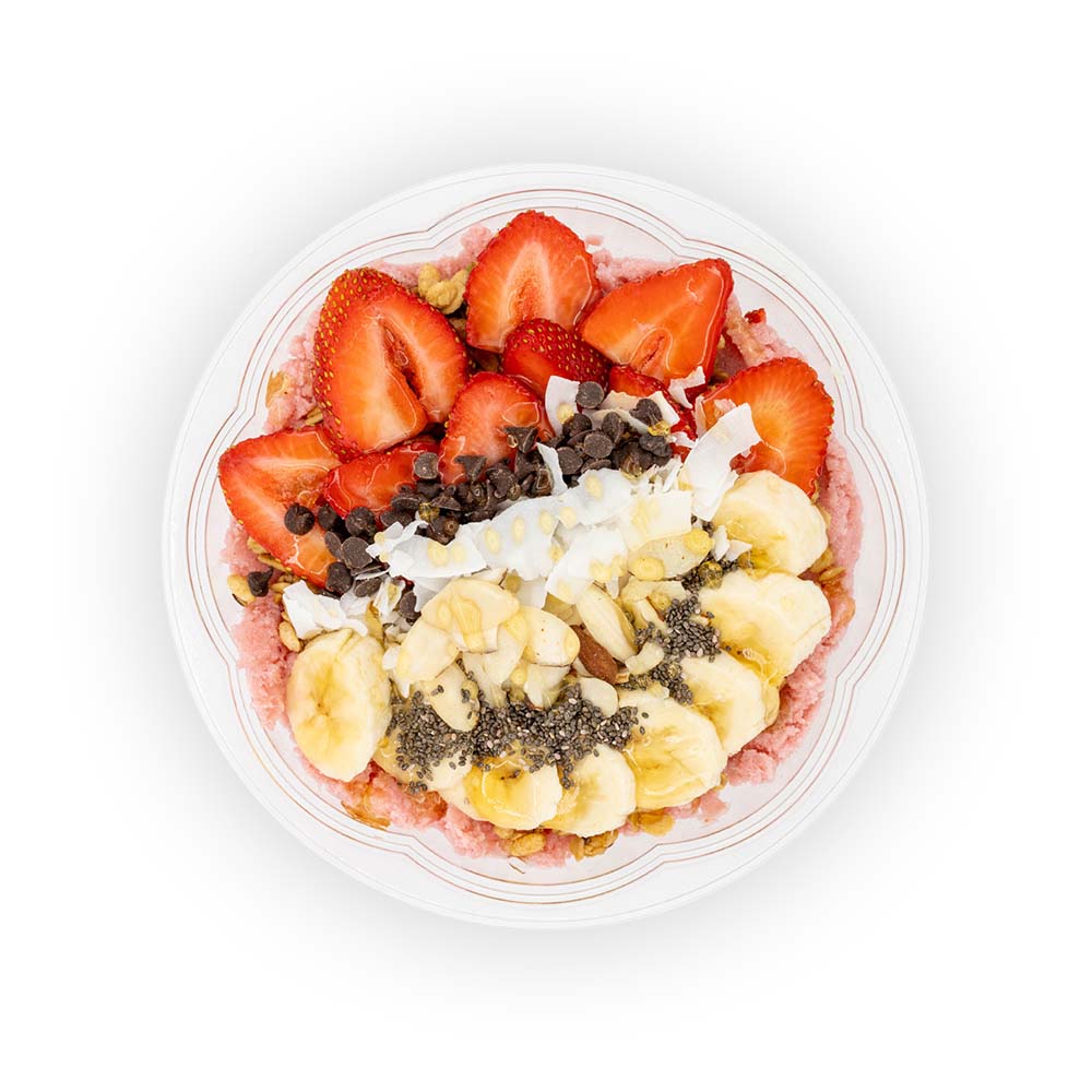 Base: Strawberries, banana, pb powder, heavy creamToppings: Strawberries, banana, granola, almonds, unsweetened coconut flakes, chia seeds, cocoa chips, honey drizzle