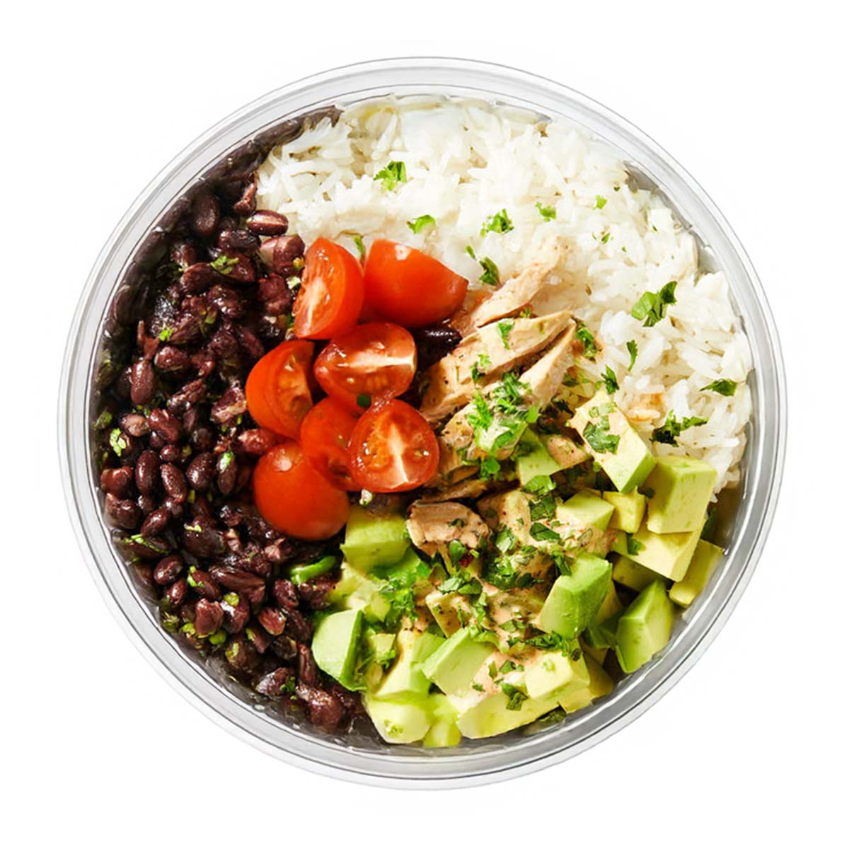 Flavor-packed rice bowls with beans, veggies, pumpkin seeds, cilantro, and avocado — available veggie or with chicken.